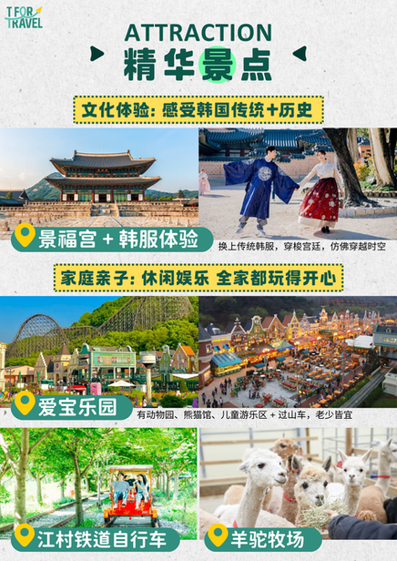 适合各个年龄层的韩国之旅,结合了趣味体验、文化探索与自然美景。走访知名景点如爱宝乐园和南怡岛,享受悠闲时光与迷人风景。还将造访羊驼牧场和紫菜博物馆,参与互动体验,感受在地风情。旅途中换上韩服,走进景福宫,漫步北村韩屋村,沉浸在韩国浓厚的历史与文化之中,留下难忘回忆。