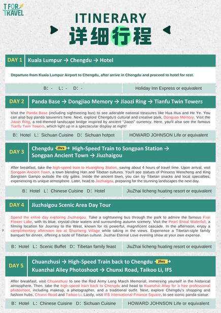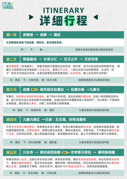 一次过带你玩遍三城市的独特魅力!在【成都】,游览宽窄巷子,品尝地道川菜,感受古老与现代的融合。8D魔幻城市【重庆】 感受山城的立体魔幻风光。【九寨沟】欣赏如画的湖泊、瀑布和五彩斑斓的自然美景,让人仿佛置身仙境。